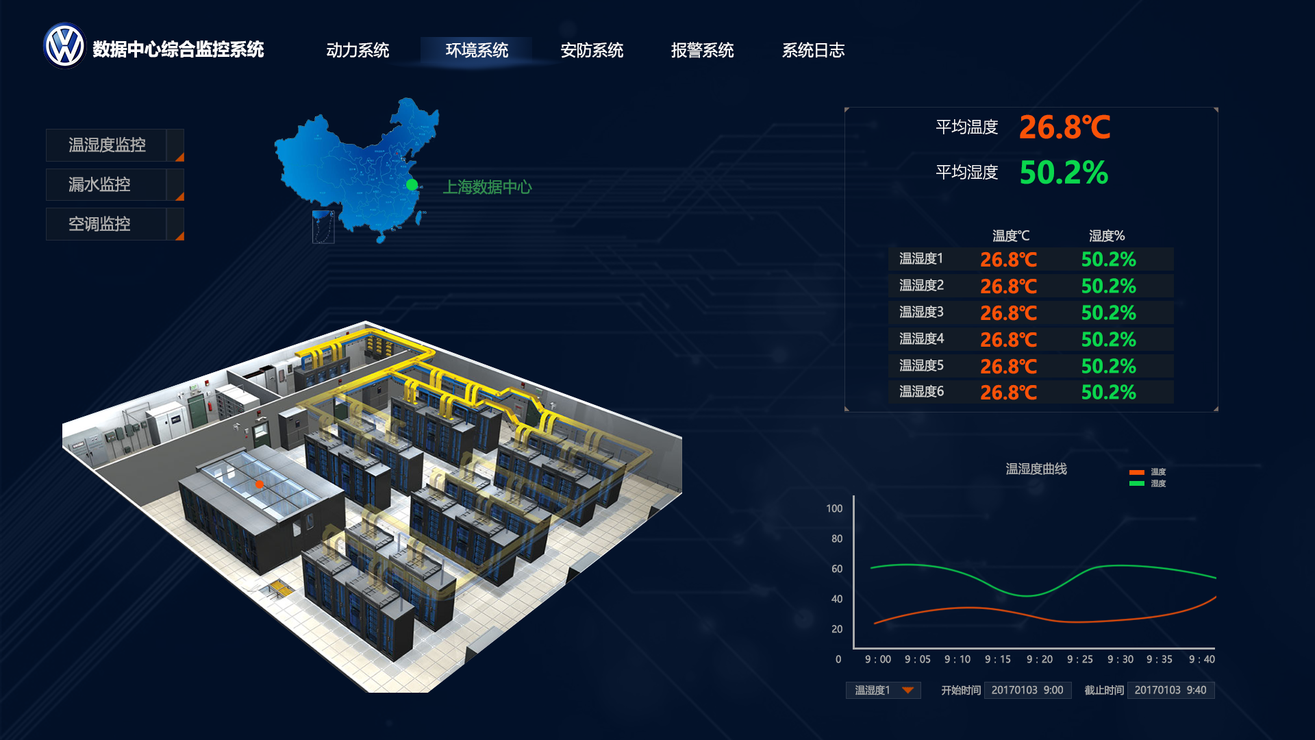 以電子地圖方式實時顯示并記錄每個溫濕度傳感器所檢測到的室內溫度與濕度的數值,顯示短時間段內的變化情況曲線圖。并可設定每個溫濕度傳感器的溫度與濕度的上限與下限值。當任意一個溫濕度傳感器檢測到的數據超過設定的上限或下限時,監控主系統發出報警。