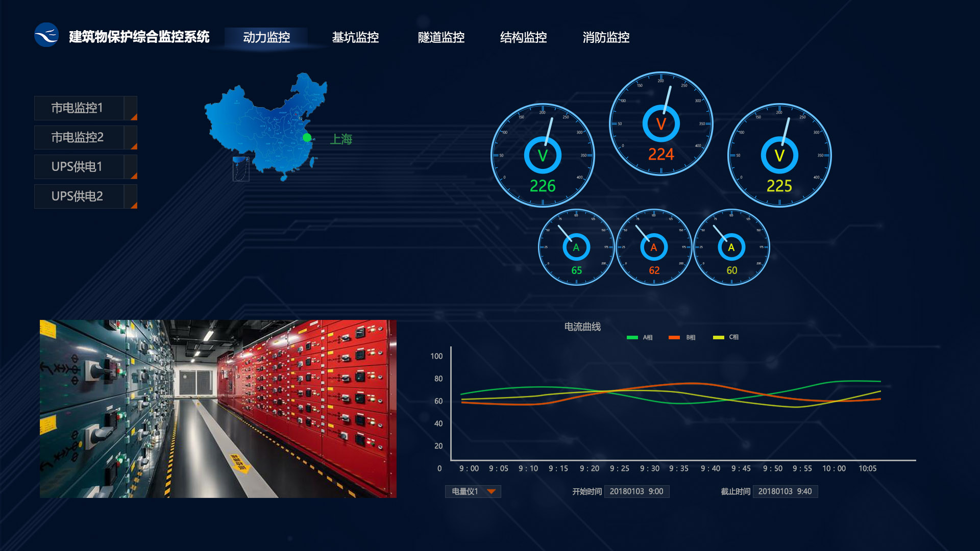 通過監視各配電柜進線三相電源的相電壓、線電壓、電流、頻率、功率因數、有功功率、無功功率等參數。對于重要的參數,可作曲線記錄,系統管理員和操作員可以通過歷史曲線圖查